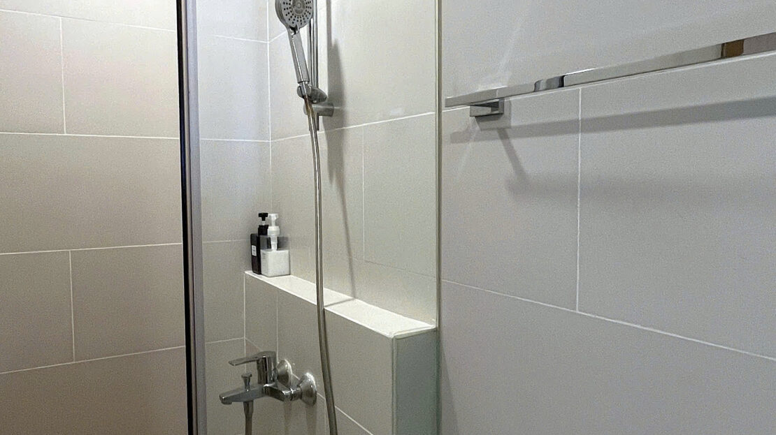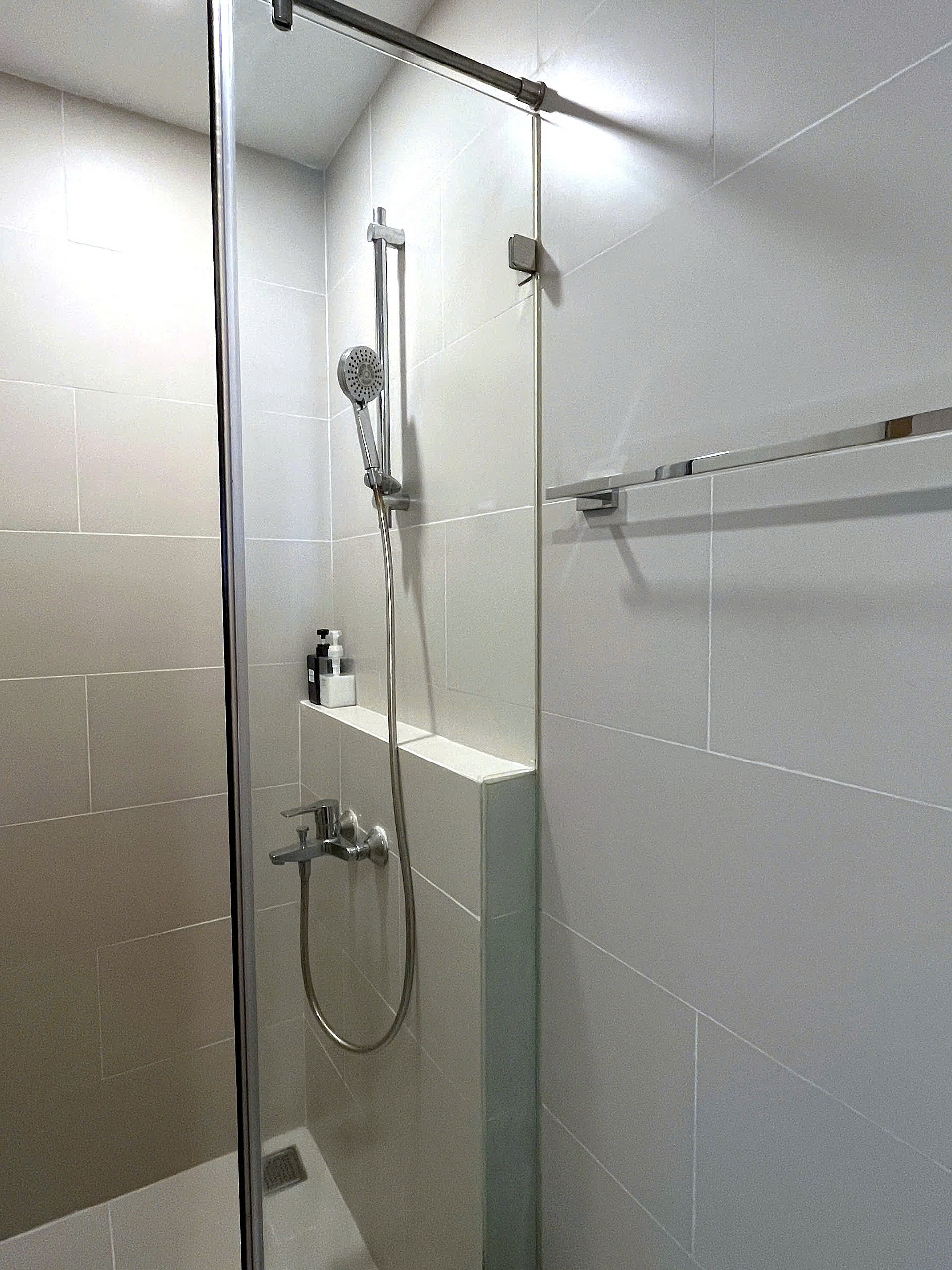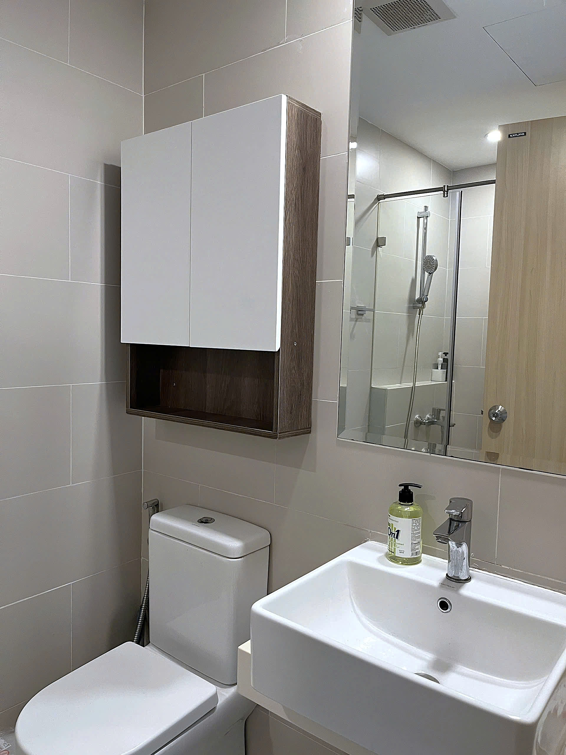- Luxury bathroom with standing glass shower, wall cabinets and washer dryer included in the apartment