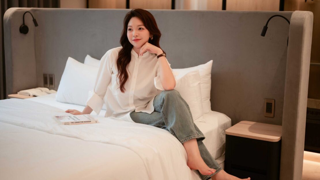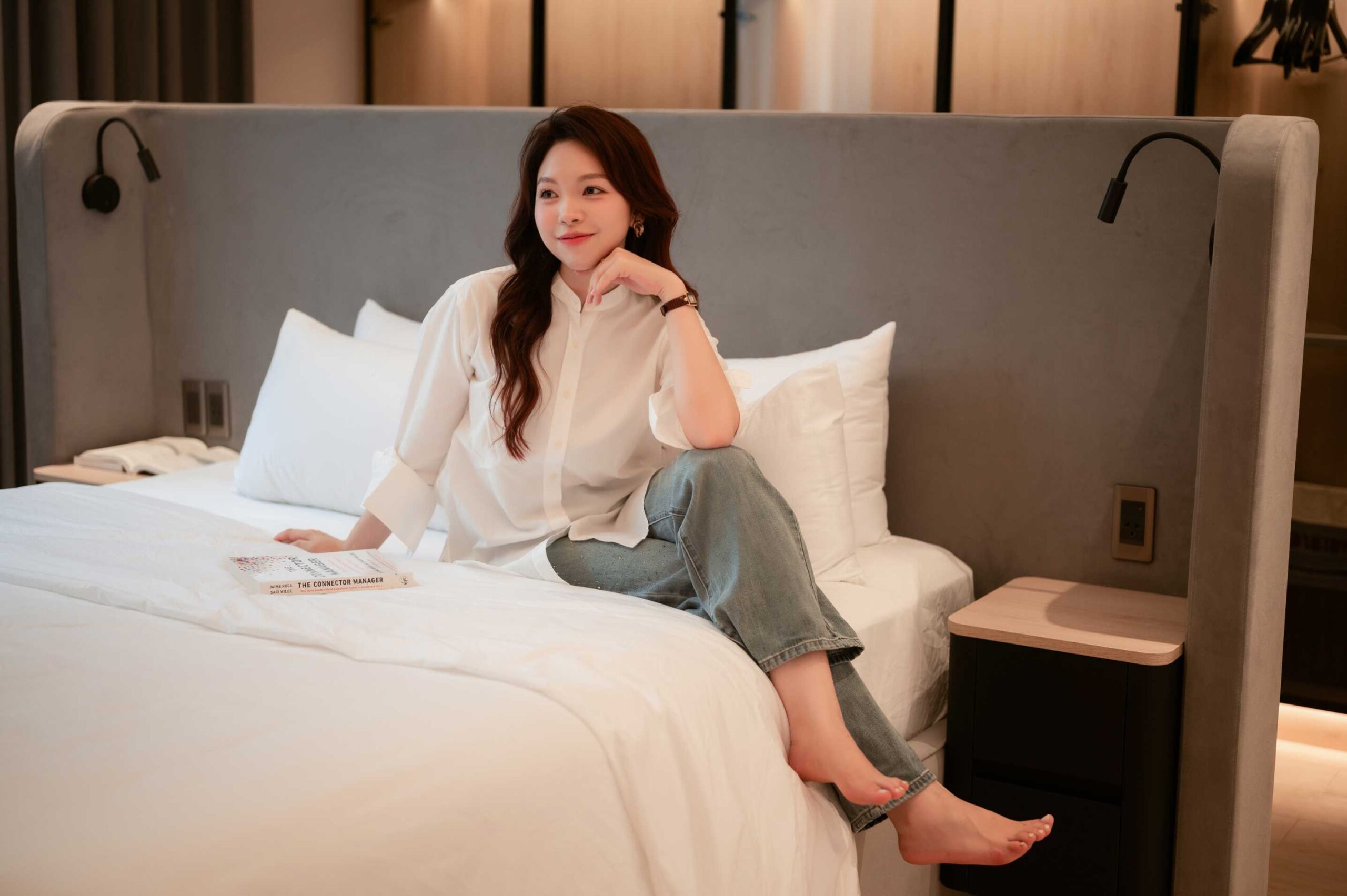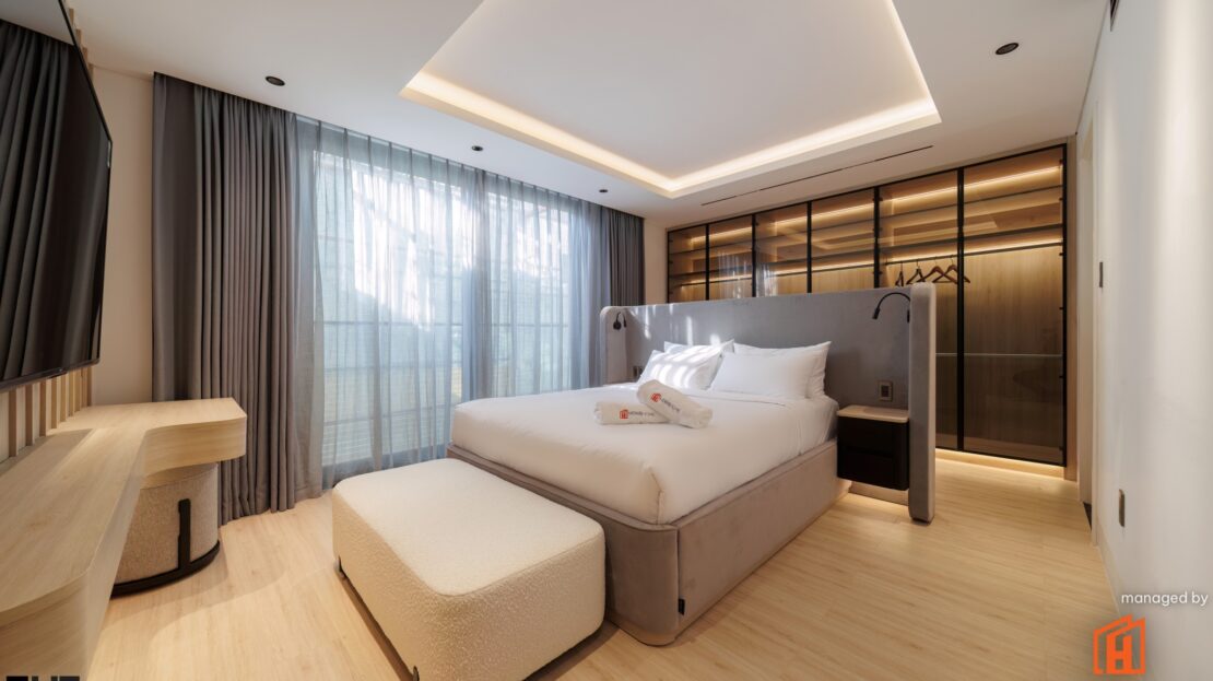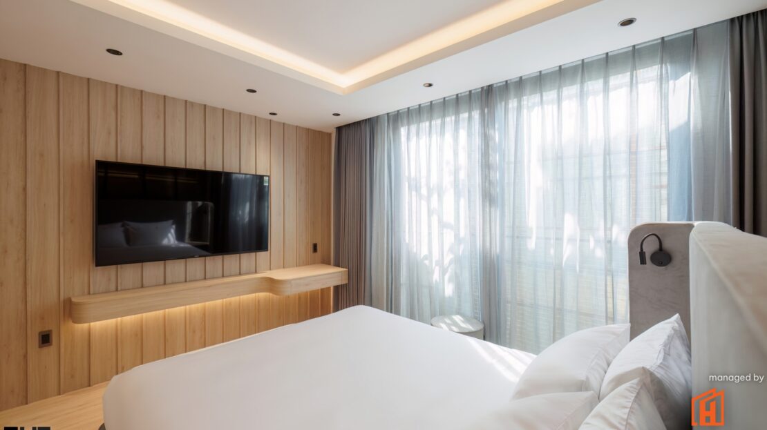 • Phòng ngủ yên tĩnh với giường cỡ Queen, khăn trải giường sang trọng và TV thông minh
