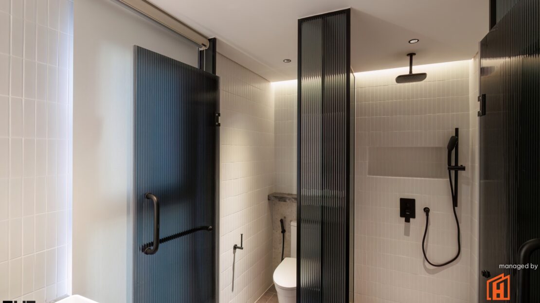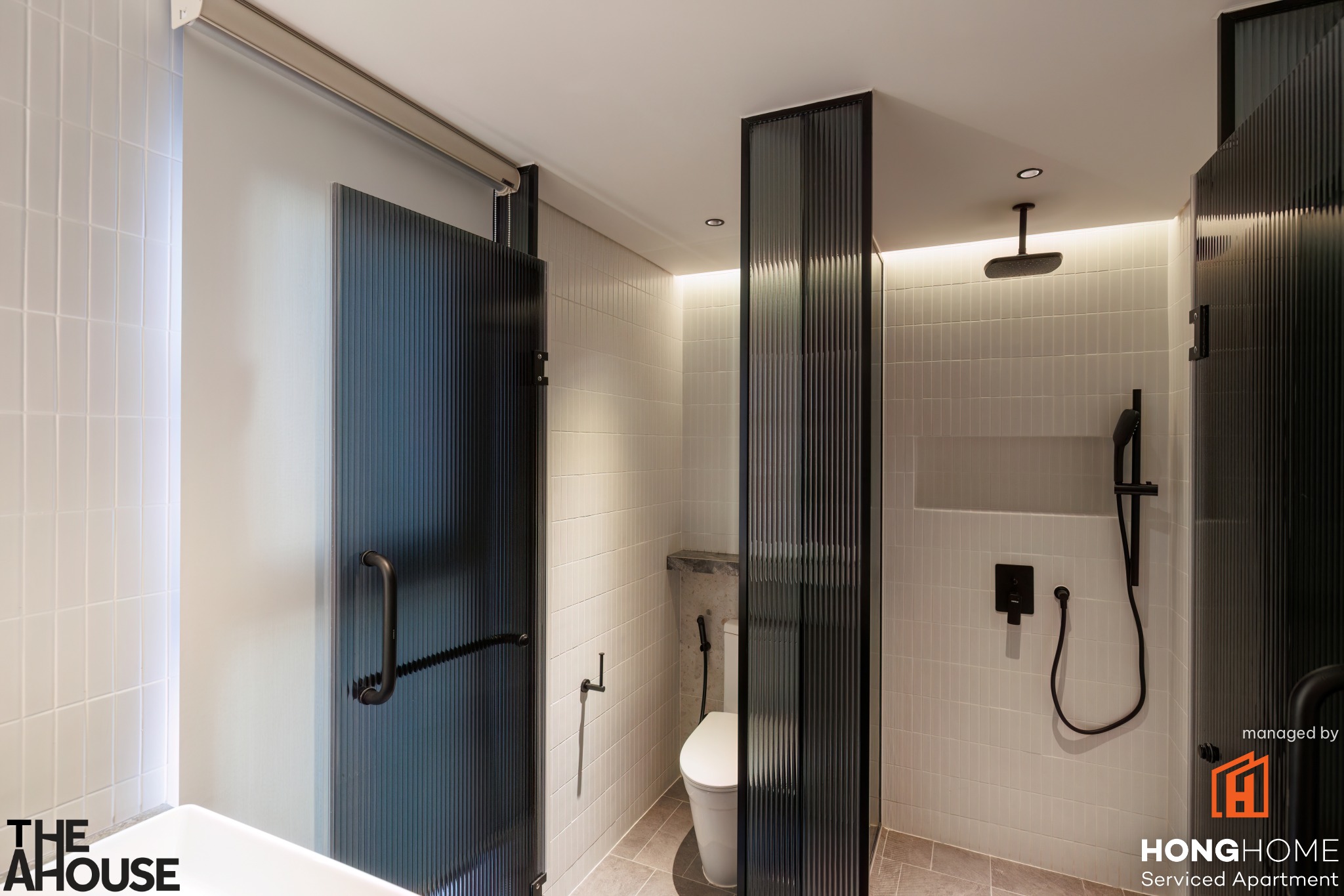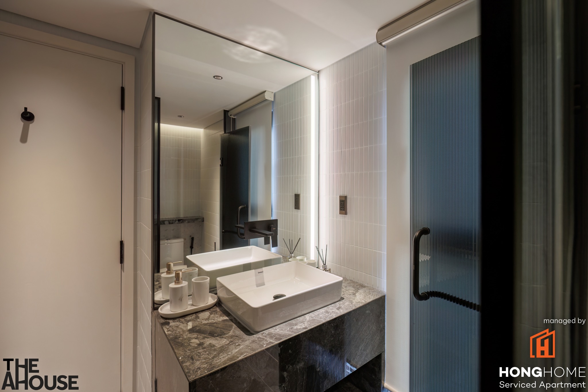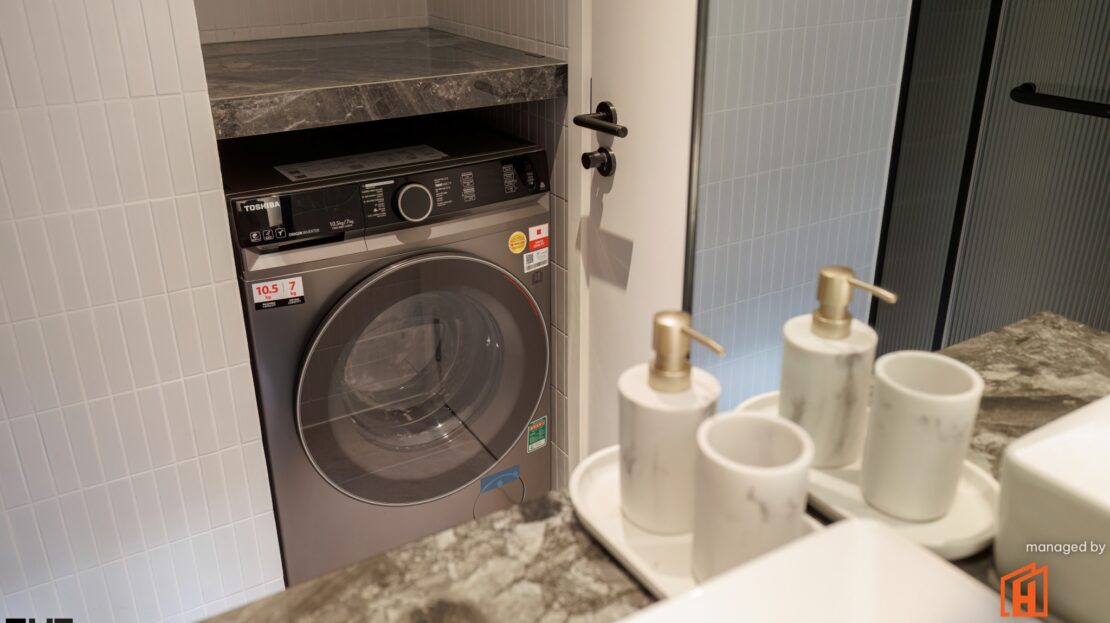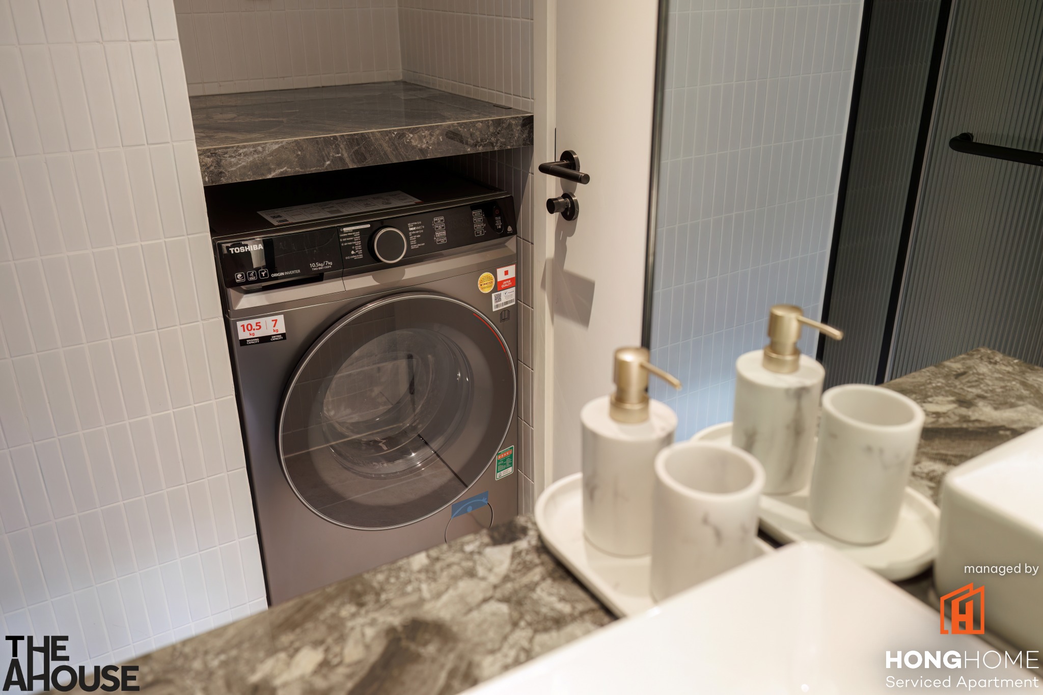 • Phòng tắm sang trọng với vòi sen kính đứng, tủ treo tường và máy giặt sấy sẵn trong căn hộ