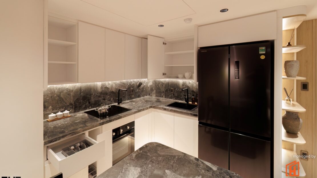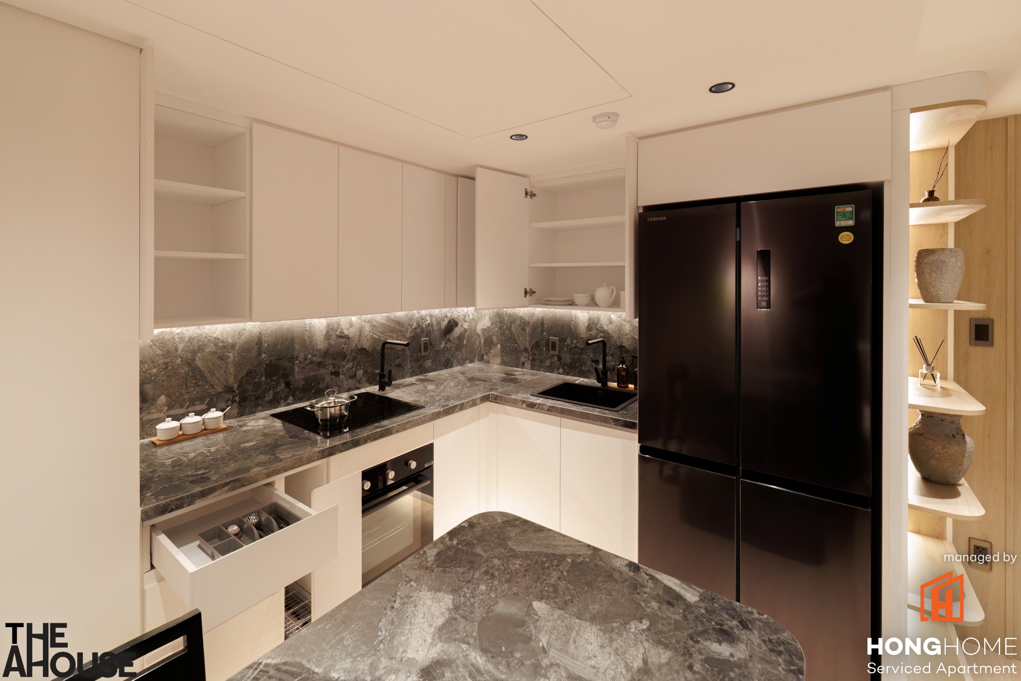 • Bếp nấu ăn đầy đủ tiện nghi với lò nướng, bếp nấu, máy hút mùi và tủ lạnh sức chứa lớn.