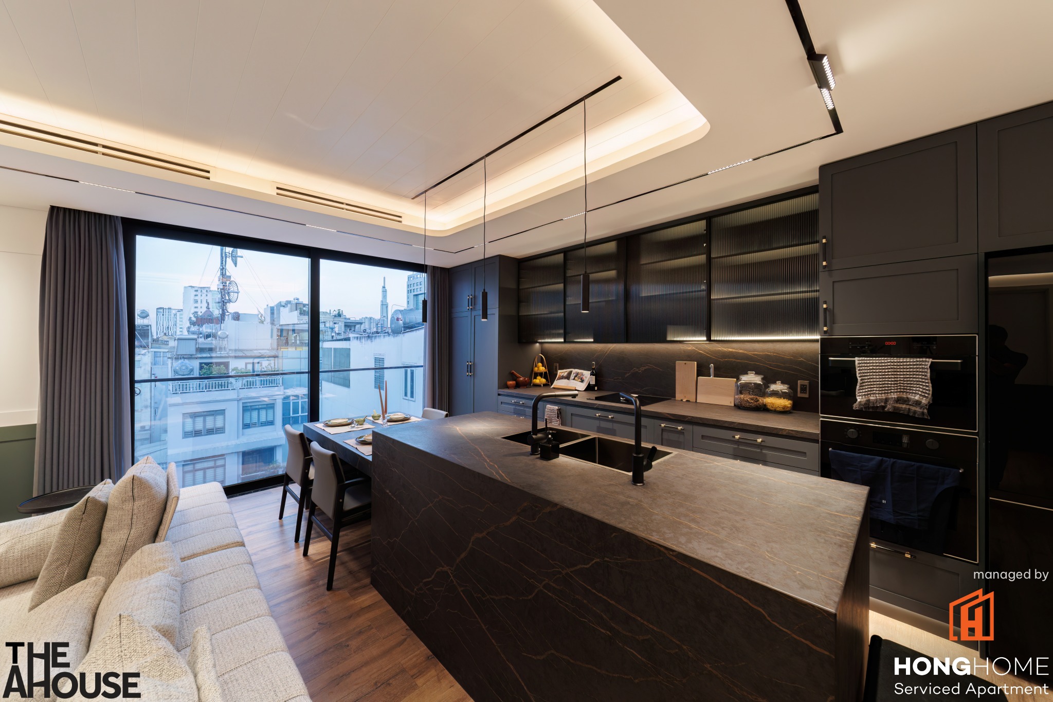 - Bếp nấu ăn đầy đủ tiện nghi với lò nướng, bếp nấu, máy hút mùi và tủ lạnh sức chứa lớn.