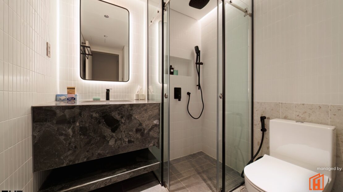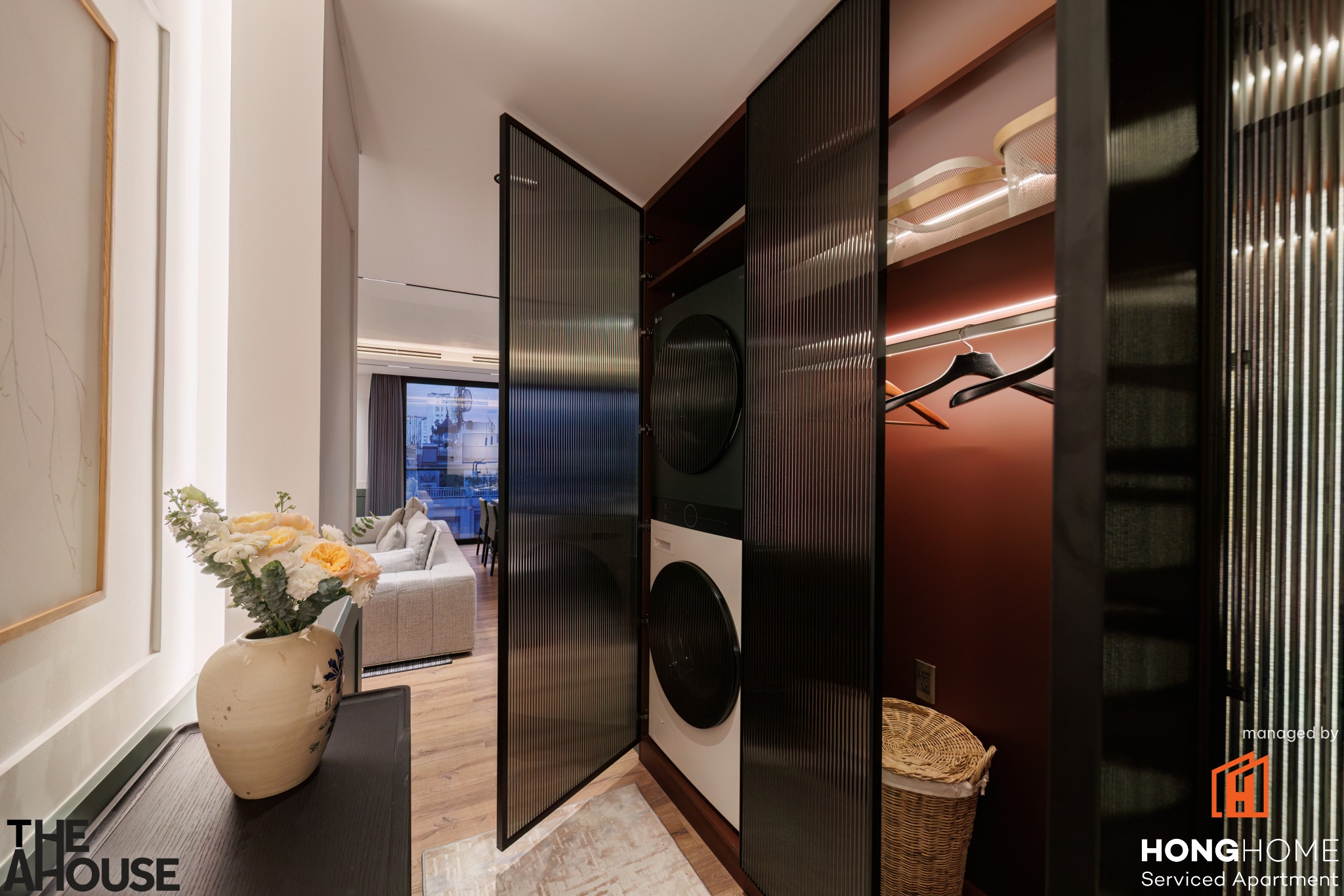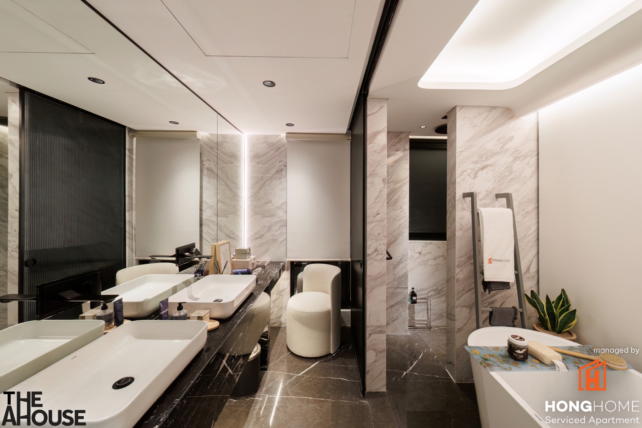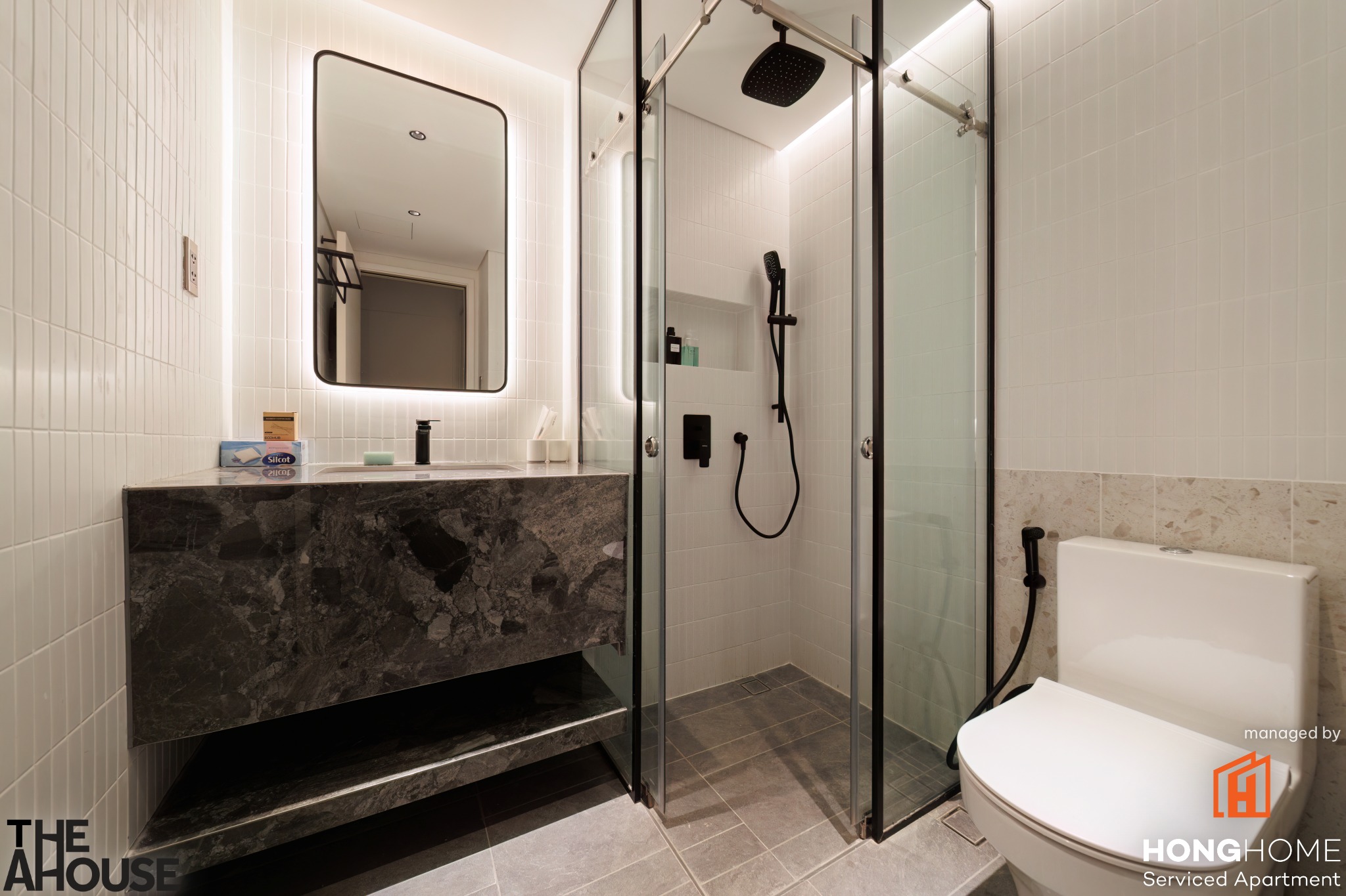 - Phòng tắm sang trọng với vòi sen kính đứng, tủ treo tường và máy giặt sấy sẵn trong căn hộ