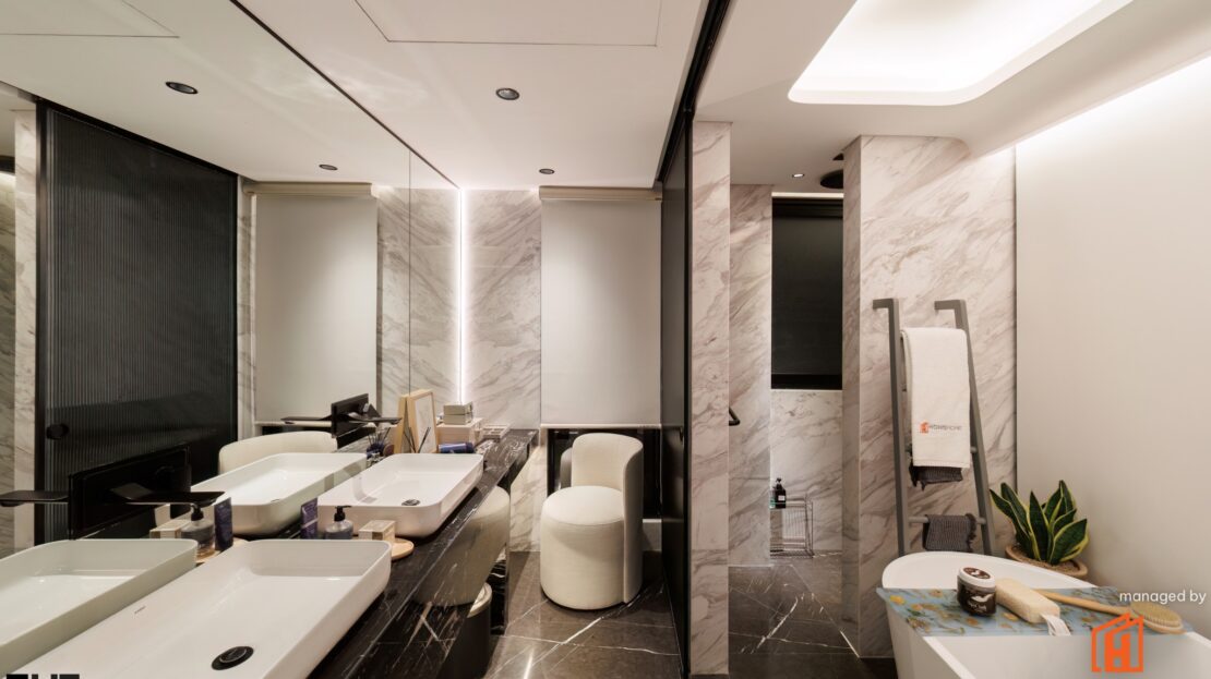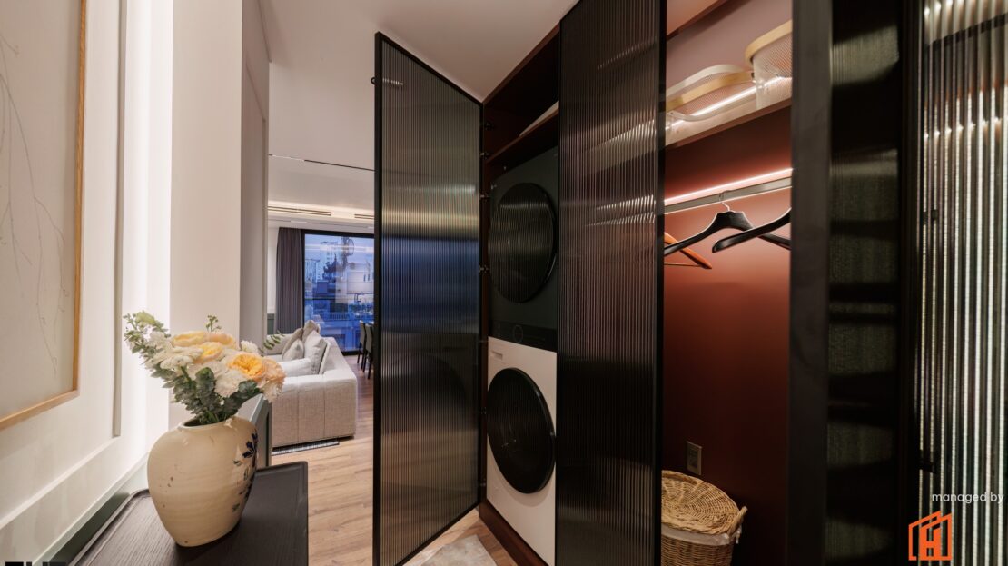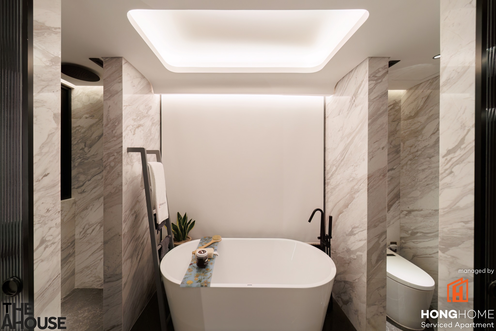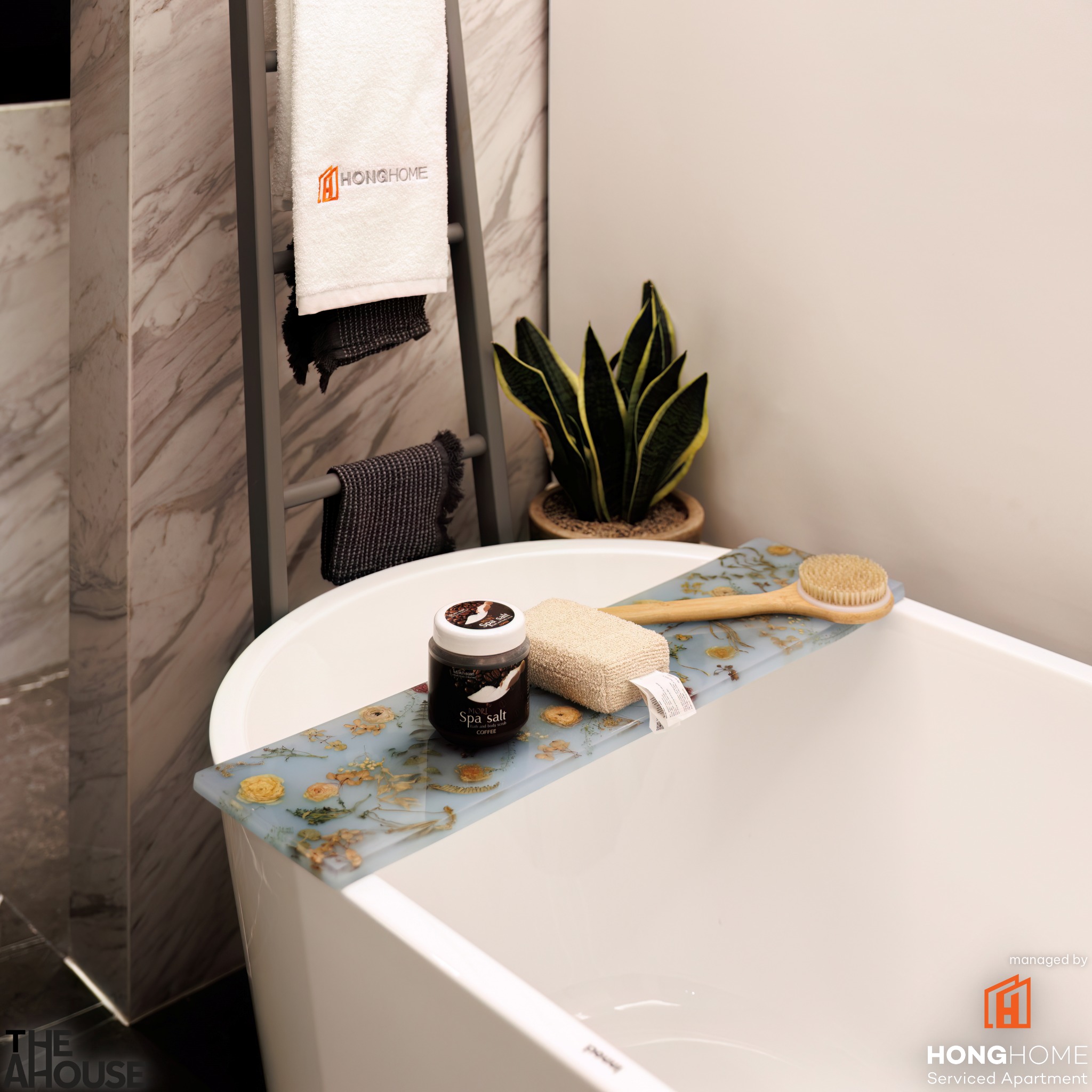 - Phòng tắm sang trọng với vòi sen kính đứng, tủ treo tường và máy giặt sấy sẵn trong căn hộ
