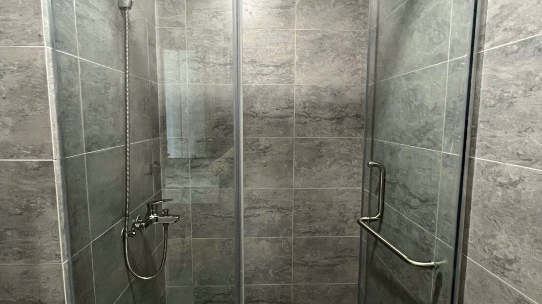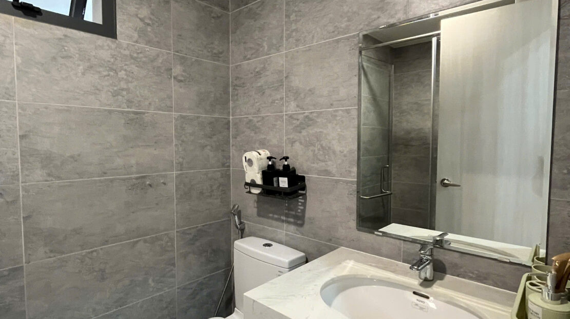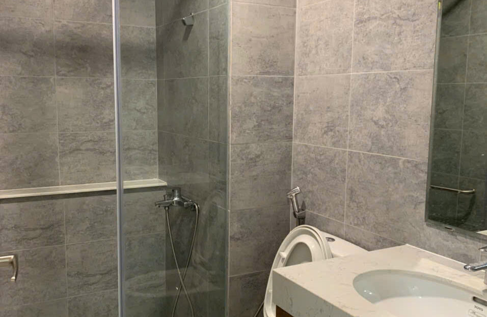 - Phòng tắm sang trọng với vòi sen kính đứng, tủ treo tường và máy giặt sấy sẵn trong căn hộ