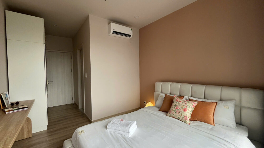 - Phòng ngủ yên tĩnh với giường cỡ Queen, khăn trải giường sang trọng và TV thông minh