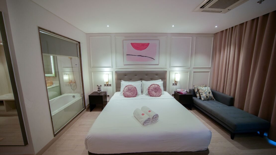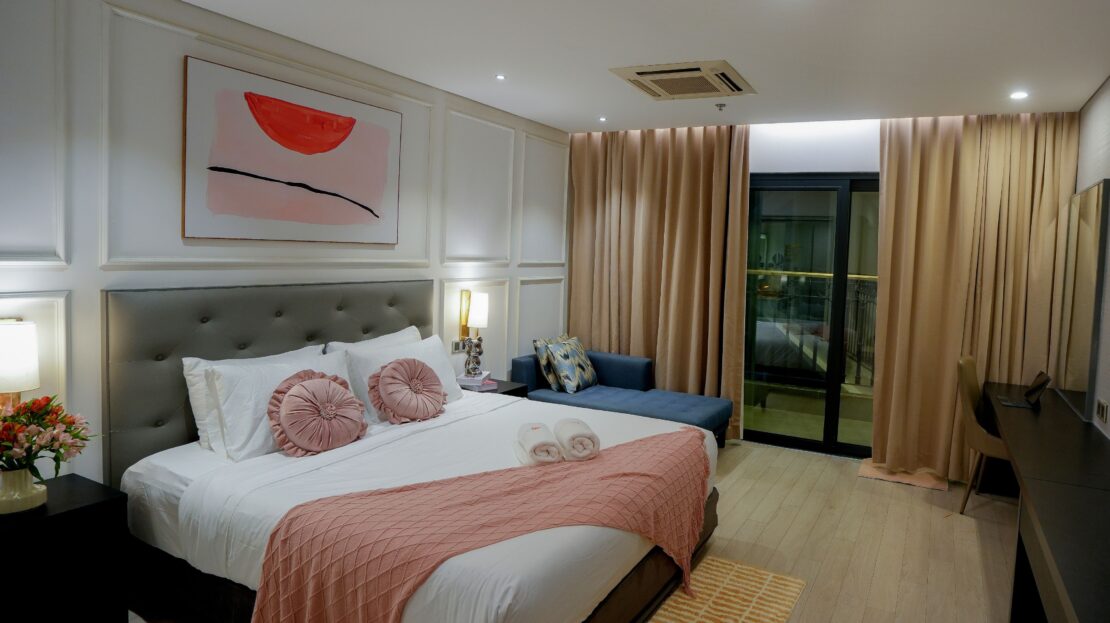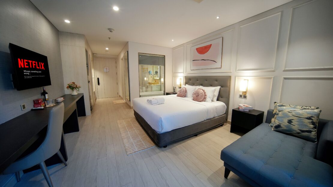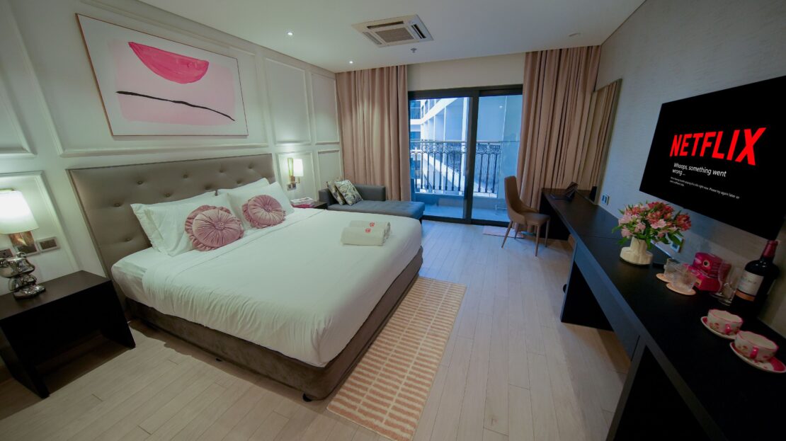 Phòng ngủ Superior được trang bị nội thất hiện đại và tiện nghi vệ sinh cao cấp, mang đến cho quý khách một trải nghiệm sống đẳng cấp. Vách kính ngăn cách khu vực tắm và phòng ngủ tạo nên không gian sinh hoạt chung rộng mở. Với ban công riêng và cửa kính, quý khách có thể ngắm nhìn toàn cảnh hình dáng chữ “H” của tòa nhà và khung cảnh xung quanh được thiết kế riêng cho quý khách. Quý khách có thể tận hưởng sự thoái mái và tiện lợi của giường cỡ King cùng SmartTV màn hình phẳng trong phòng ngủ, linh hoạt phù hợp cho các cặp đôi du lịch hoặc nhóm bạn bè.